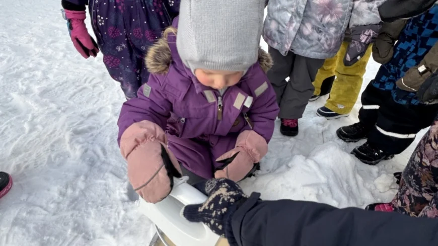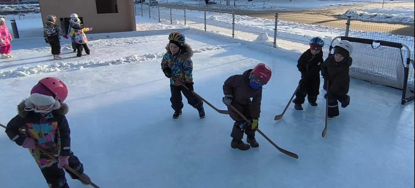 4.A grupas skolotājs Kristers, iesaistot citus darbiniekus, ir izveidojis slidotavu, kuru bērni gan sagatavo slidošanai, gan vingrinās hokejā, gan apgūst kērlinga pamatus.
